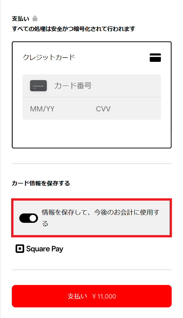 ご請求の都度カード情報をご入力いただく事がないように、赤枠の『情報を保存して、今後のお会計に使用する』にチェックを入れていただくようお願い致します。