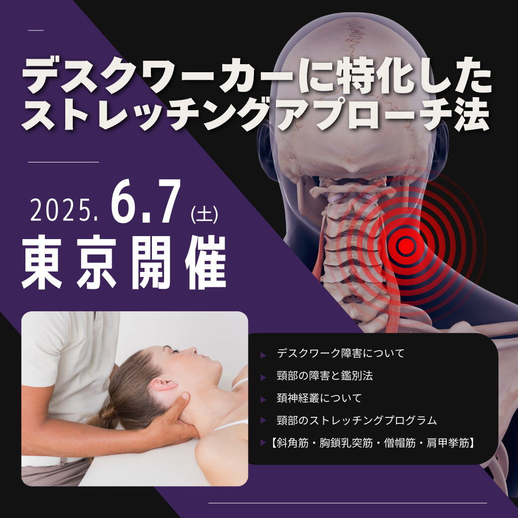 頸部の解剖学から紐解くデスクワーク障害をもとに、鑑別法や神経の構造からストレッチングへと結びつけていきます。頸部は事故のリスクが多くあるため、正しい知識を身につける必要があります。