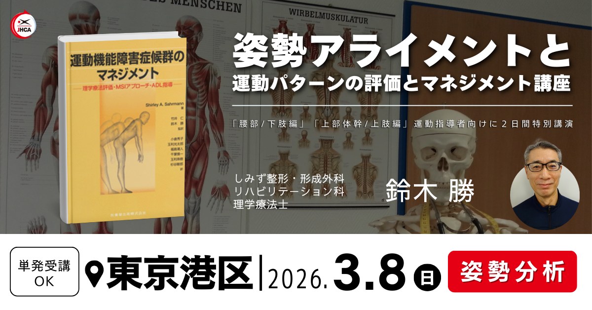 | この度、JHCAスポーツ&ビューティー学校では、2025年度 特別講演を開催いたします。 しみず整形・形成外科 リハビリテーション科/理学療法士 鈴木 勝先生をお招きして 「姿勢アライメントと運動パターンの評価とマネジメント」について、運動指導者向けに2日間特別講演を開催いたします。 是非、この機会に受講お申込みください。 |