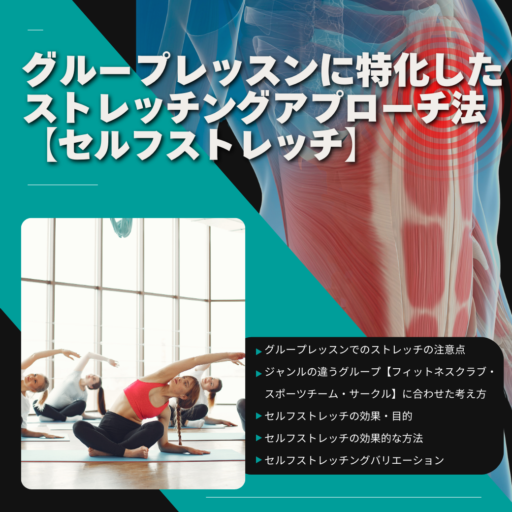 ![]() | グループレッスンに特化したストレッチングアプローチ【セルフストレッチ】 ・グループレッスンでストレッチを行う際の注意点 ・ジャンルの違うグループ【フィットネスクラブ・スポーツチーム・サークル】に合わせた考え方 ・セルフストレッチの効果・目的 ・セルフストレッチの効果的な方法 ・セルフストレッチングバリエーション |