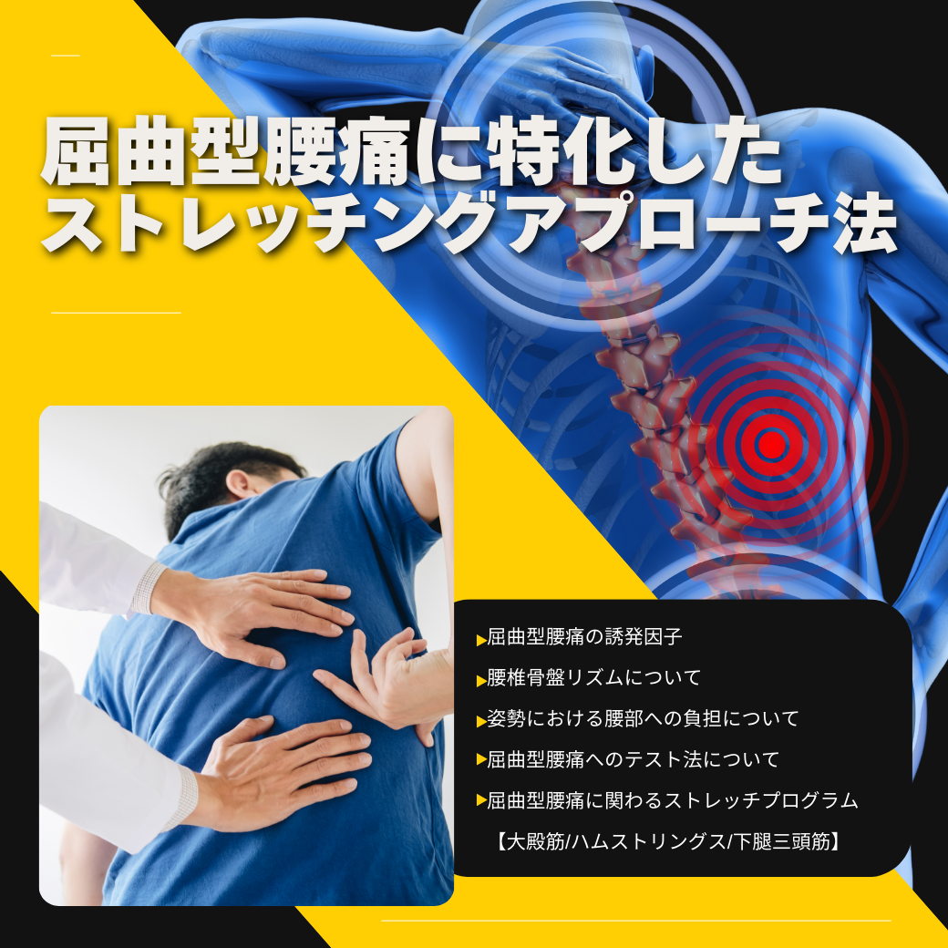 ![]() | 屈曲型腰痛に特化したストレッチングアプローチ法 ・屈曲型腰痛の誘発因子 ・腰椎骨盤リズムについて ・姿勢における腰部への負担について ・屈曲型腰痛へのテスト法について ・屈曲型腰痛に関わるストレッチングプログラム 【大殿筋/ハムストリングス/下腿三頭筋】 |