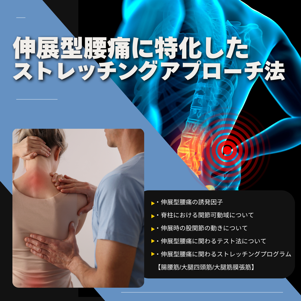 ![]() | 伸展型腰痛に特化したストレッチングアプローチ法 ・伸展型腰痛の誘発因子 ・脊柱における関節可動域について ・伸展時の股関節の動きについて ・伸展型腰痛に関わるテスト法について ・伸展型腰痛に関わるストレッチングプログラム 【腸腰筋/大腿四頭筋/大腿筋膜張筋】 |