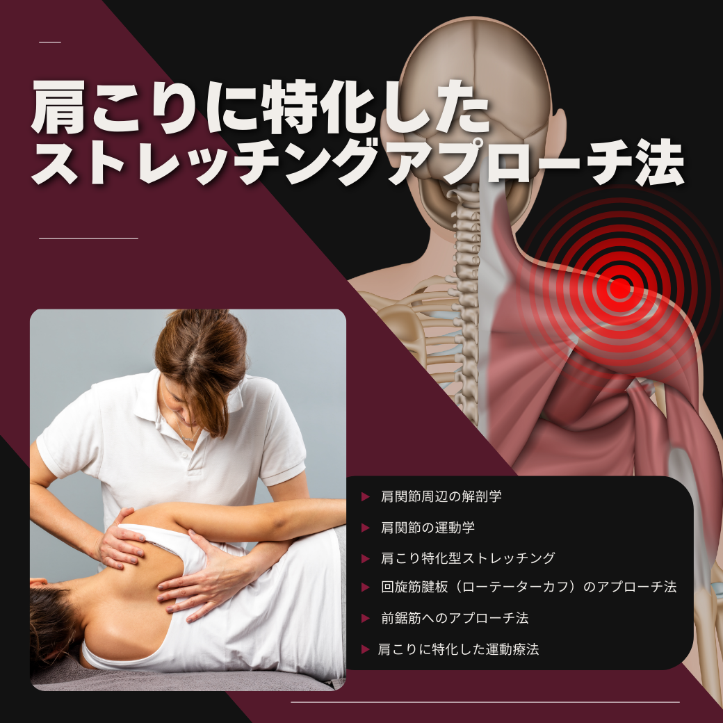 ![]() | 肩こりに特化したストレッチングアプローチ法 ・肩関節周辺の解剖学 ・肩関節の運動学 ・肩こり特化型ストレッチング ・回旋筋腱板(ローテーターカフ)のアプローチ法 ・前鋸筋へのアプローチ法 ・肩こりに特化した運動療法 |