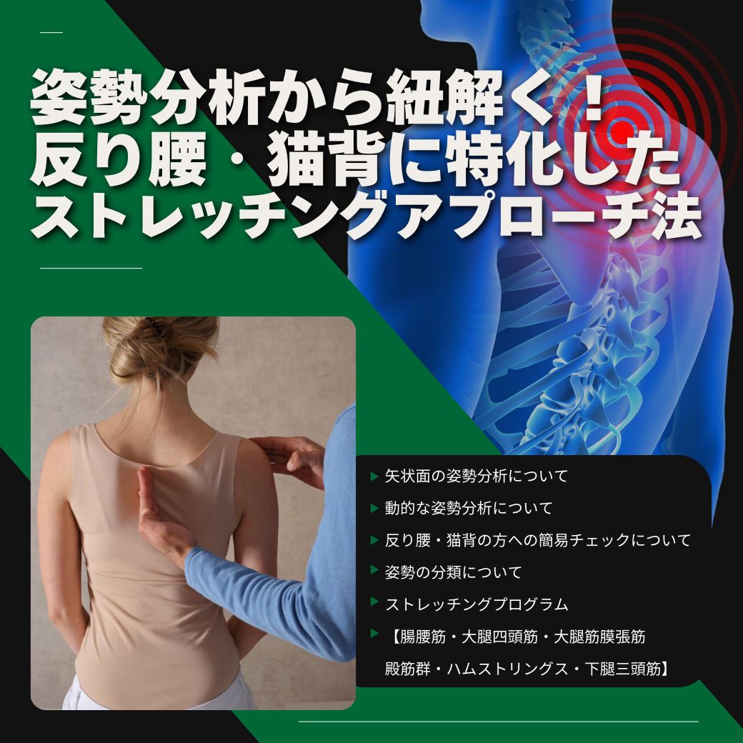 姿勢分析から紐解く!反り腰・猫背に特化したストレッチングアプローチ法 ・矢状面での姿勢分析について ・動的な姿勢分析について ・反り腰・猫背の方への簡易チェックについて ・姿勢の分類について ・ストレッチングプログラム 【腸腰筋・大腿四頭筋・大腿筋膜張筋・殿筋群・ハムストリングス・下腿三頭筋】 | |