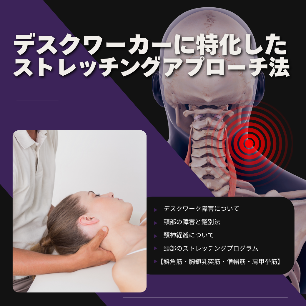 ![]() | デスクワーカーに特化したストレッチングアプローチ法 ・デスクワーク障害について ・頸部の障害と鑑別法 ・頚神経叢について ・頸部のストレッチングプログラム 【斜角筋・胸鎖乳突筋・僧帽筋・肩甲挙筋】 |