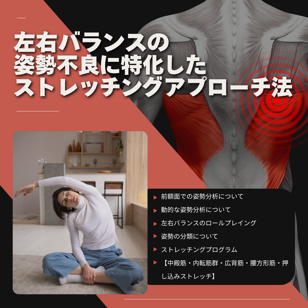 ![]() | 左右バランスの姿勢不良に特化したストレッチングアプローチ法 ・前額面での姿勢分析について ・動的な姿勢分析について ・左右バランスのロールプレイング ・姿勢の分類について ・ストレッチングプログラム 【中殿筋・内転筋群・広背筋・腰方形筋・押し込みストレッチ】 |