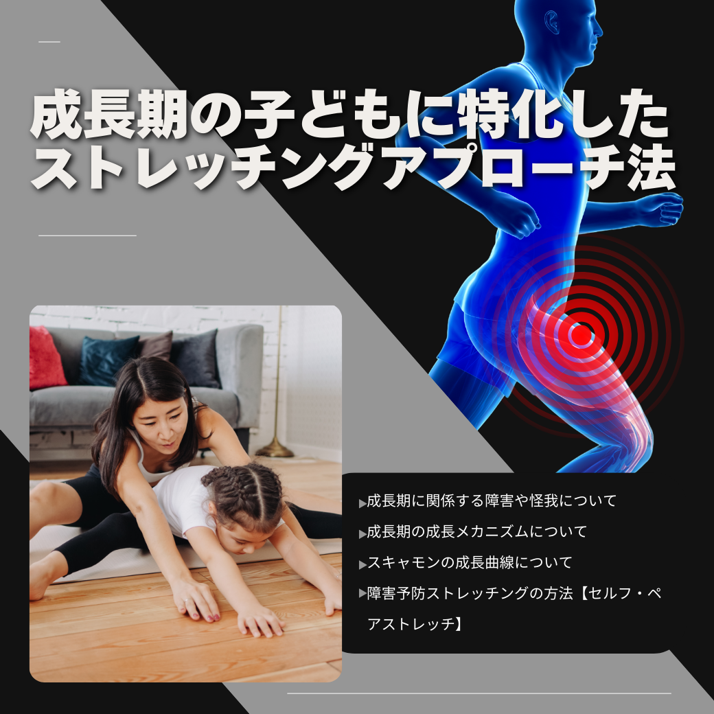 ![]() | 成長期の子どもに特化したストレッチングアプローチ法 ・成長期に関係する障害や怪我について ・成長期の成長メカニズムについて ・スキャモンの成長曲線について ・障害予防ストレッチングの方法【セルフ・ペアストレッチ】 |