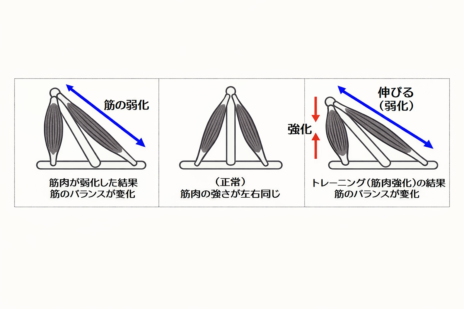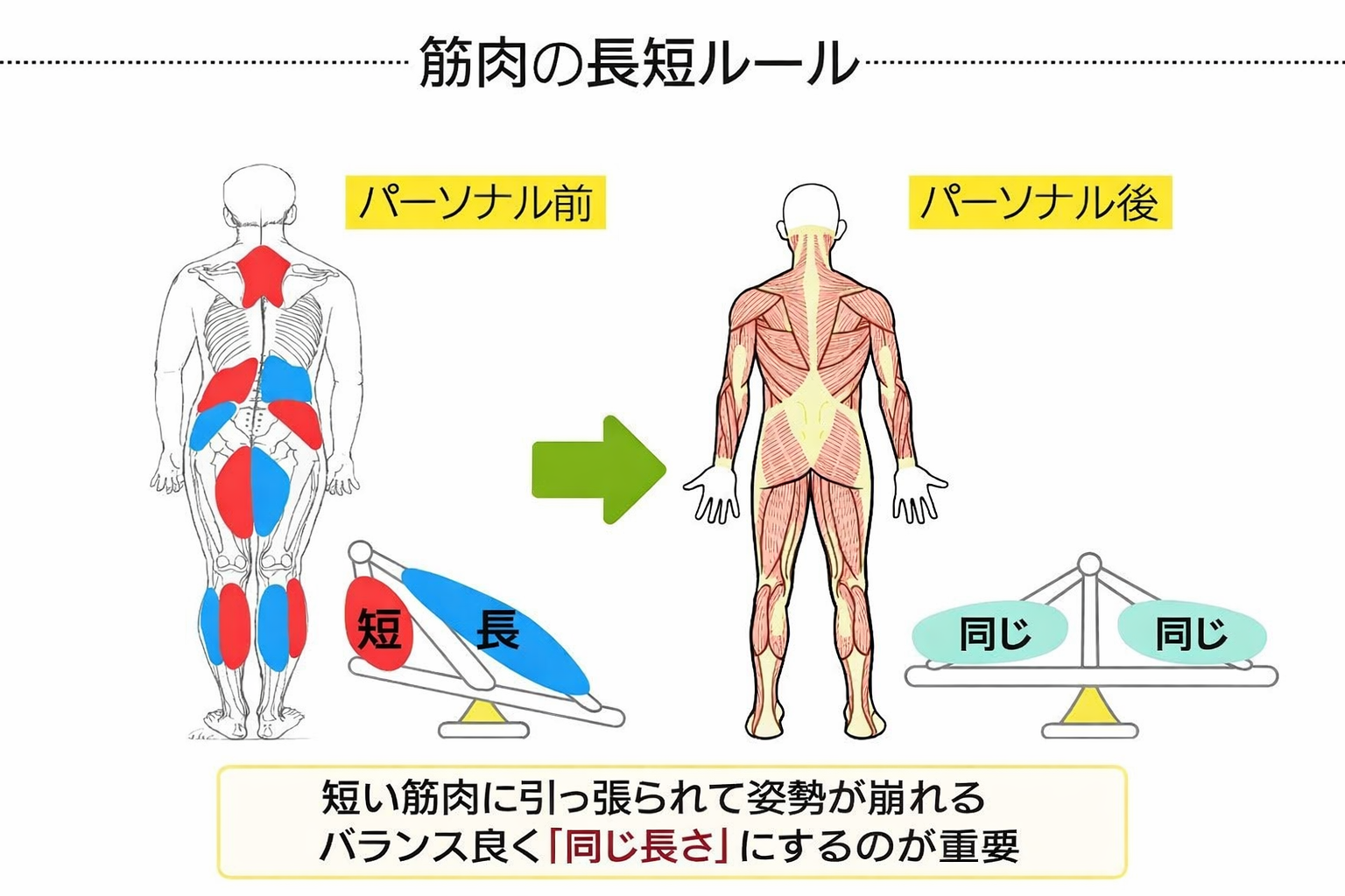コンディショニングとは、トレーニング効果を最大限に引き出すための“土台づくりであり、 運動指導の質を決定づける中核技術です。 その目的は、単に運動を指導することではなく、 ・お客様一人ひとりの身体状態に合わせて ・安全かつ効果的に ・継続可能な運動指導を実現すること *すなわち、「個別最適化された運動指導サービスの提供」にあります。 ■ コンディショニングの本質=「長短ルール」 コンディショニングとは、簡潔に言えば、「筋機能」と「関節機能」を整え、全身の“筋の連動連鎖”と“関節の連鎖”を 最適化するアプローチ」です。 そのために、さまざまな手技・運動テクニックを用いて、身体の機能を根本から整えていきます。