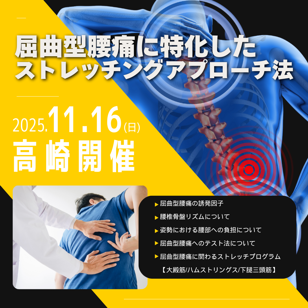 | 講習会テーマ | ・屈曲型腰痛の誘発因子 ・腰椎骨盤リズムについて ・姿勢における腰部への負担について ・屈曲型腰痛へのテスト法について ・屈曲型腰痛に関わるストレッチングプログラム 【大殿筋/ハムストリングス/下腿三頭筋】 |